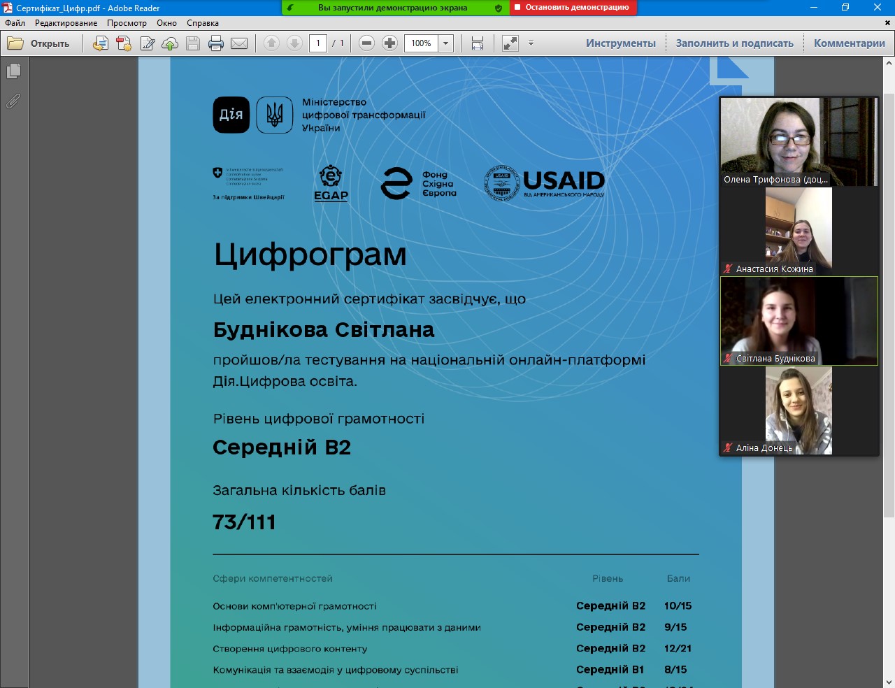 У наш час відбуваються кардинальні зміни в галузі інформаційних комунікаційних систем. Тому, в освітні програми підготовки фахівців все більше проникають питання цифрової грамотності. Дану тему підтримали студенти третього курсу групи ПН18Б зі спеціальності 014 Середня освіта (Природничі науки) і приєдналися до проходження всеукраїнського тесту «Цифрограм» на платформі «Дія. Цифрова освіта», яка надає змогу здійснити аналіз власної просвітленості в галузі всесвітньої павутини, програмних забезпечень і цифрових методик.