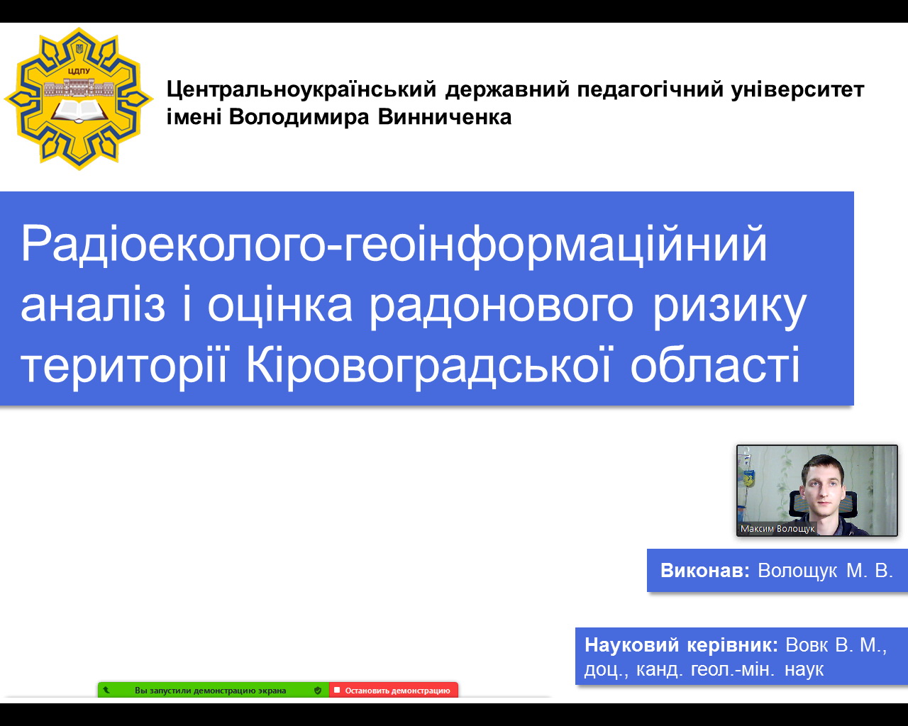 1 місце за сумою балів, набраних за оцінювання роботи, а також її захист отримав студент-магістрант спеціальності Середня освіта (Географія) Волощук Максим, який представив увазі галузевої конкурсної комісії наукову роботу на тему «Радіоеколого-геоінформаційний аналіз і оцінка радонового ризику території Кіровоградської області» (науковий керівник кандидат геолого-мінералогічних наук, доцент Вовк В.М)