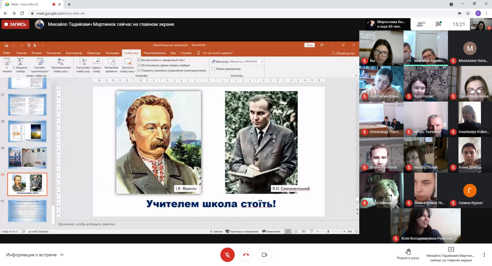 23 березня 2021 року викладачі та студенти першого (бакалаврського) і другого (магістерського) рівнів вищої освіти спеціальності 014 Середня освіта (Природничі науки) Центральноукраїнського державного педагогічного університету імені Володимира Винниченка відвідали лекцію в онлайн-форматі на тему : «Теоретичні та практичні чинники становлення і розвитку системи підготовки учителів природничих наук в умовах реалізації Концепції Нової Української Школи». Лектор: Михайло Тадейович Мартинюк – доктор педагогічних наук, професор, дійсний член (академік ) НАПН України , завідувач, професор кафедри фізики та інтегративних технологій навчання природничих наук Уманського державного педагогічного університету імені Павла Тичини.