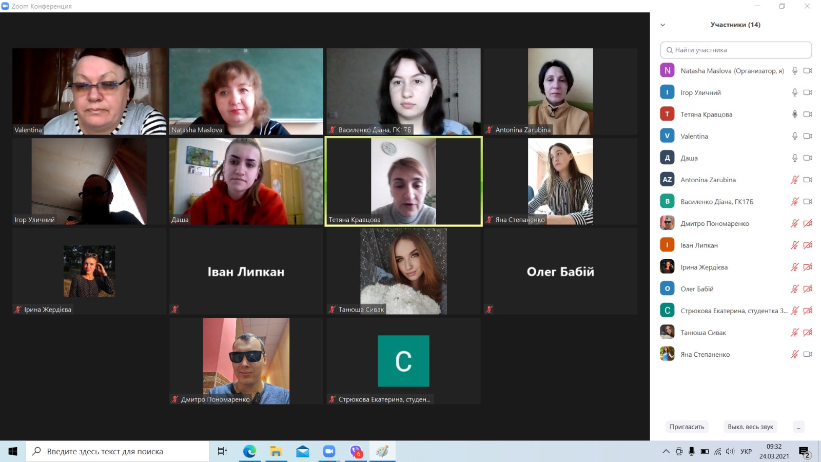 У середу, 24 березня, відбулася звітна конференція з питань проходження виробничої педагогічної практики у школі студентами спеціальності “Середня освіта (Географія)”. На заході, який проводився в режимі Zoom-конференції, були присутні студенти групи ГК17Б, керівник педагогічною практикою Маслова Н. М., методисти з фаху Мирза-Сіденко В. М. та Зарубіна А. В., методист з педагогіки Кравцова Т. О. та методист з психології Уличний І. Л.