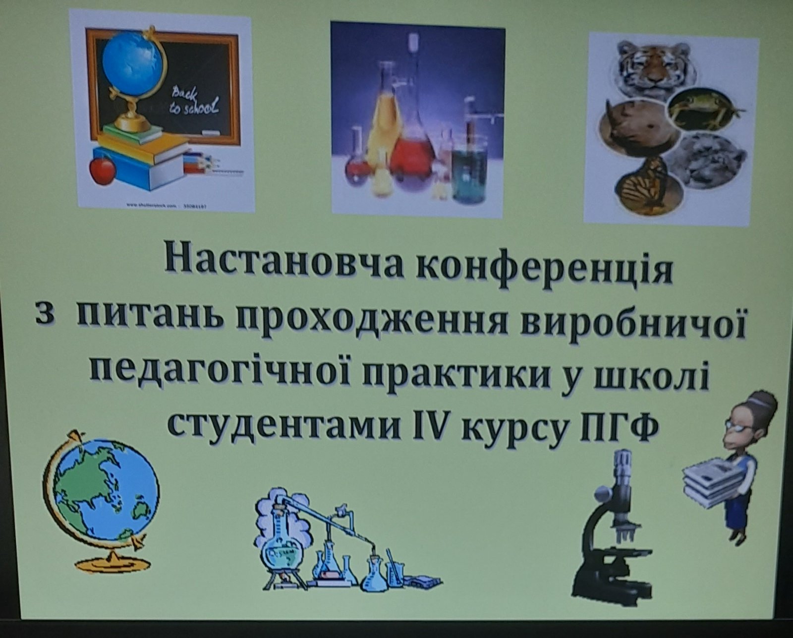 1 лютого 2021 року в режимі Zoom-конференції за участі студентів 4 курсу спеціальності 014 Середня освіта (Географія) та методистів була проведена настановча конференції з питань організації та проведення виробничої педагогічної практики у школі.