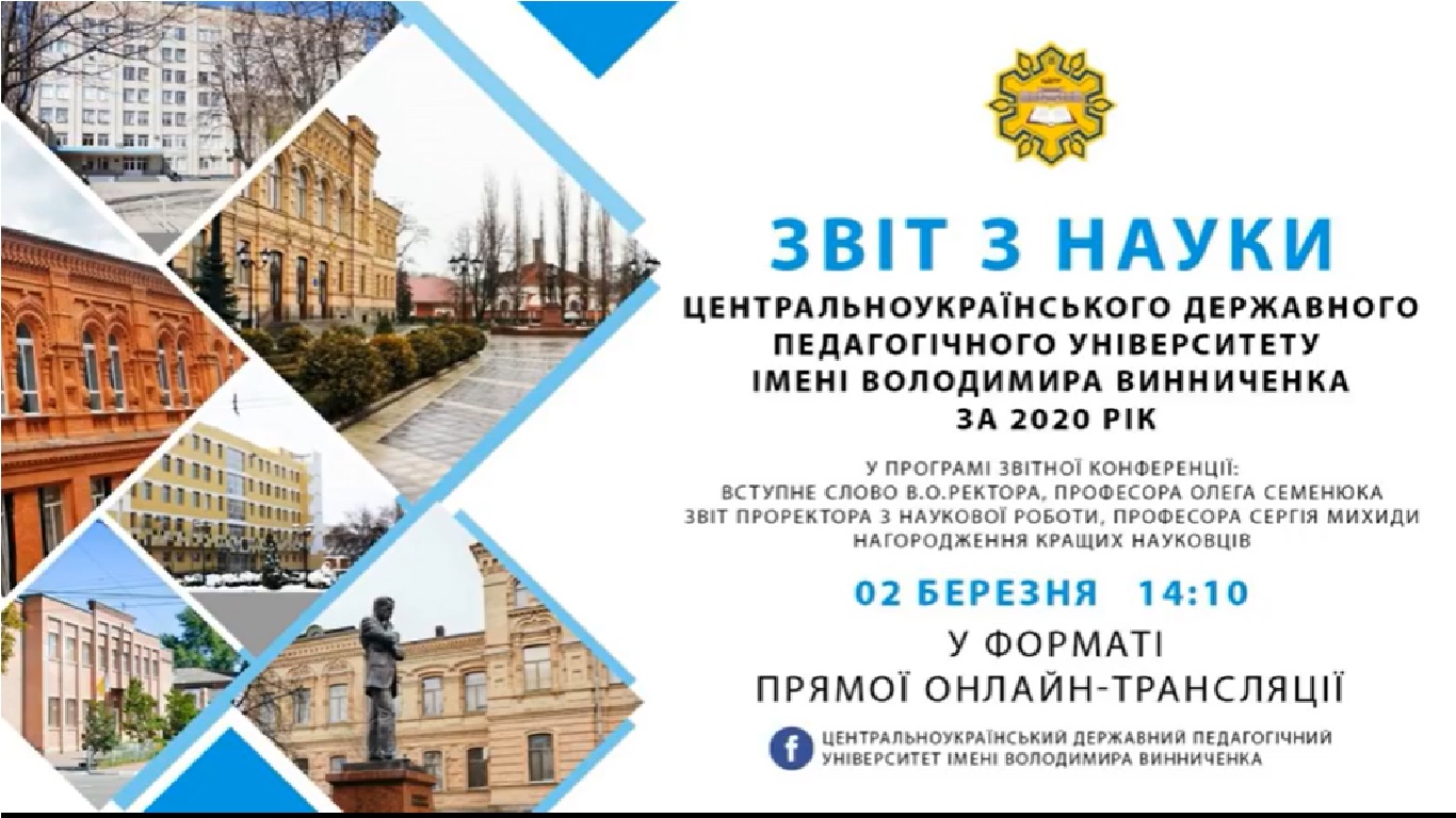 02 березня 2021 року в Центральноукраїнському державному педагогічному університеті імені Володимира Винниченка у форматі on-line-конференції відбувся звіт з науково-дослідної роботи за 2020 рік.