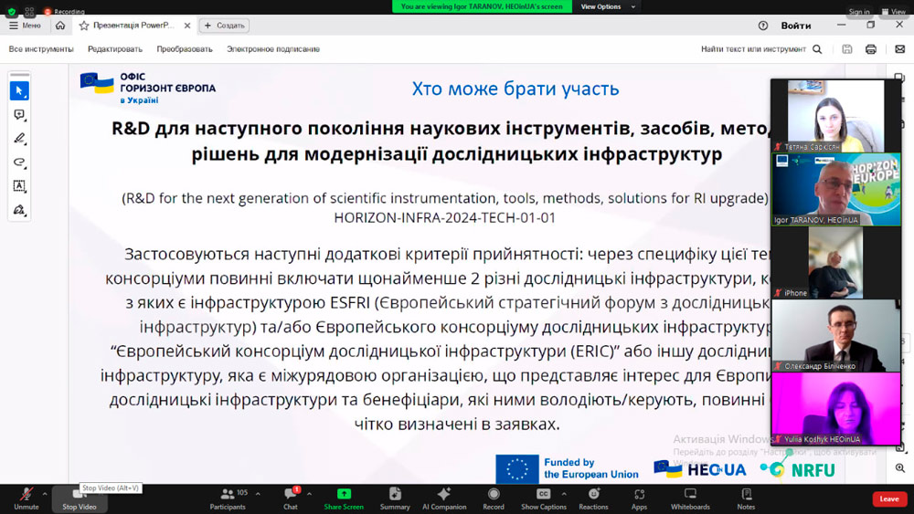 Сьогодні представник міжнародного відділу ЦДУ імені В.Винниченка Саркісян Тетяна Олегівна взяла участь у вебінарі «Можливості для українських учасників та особливості створення консорціуму у програмі «Горизонт Європа» за напрямом «Дослідницькі інфраструктури» у межах проєкту Talking about my idea».