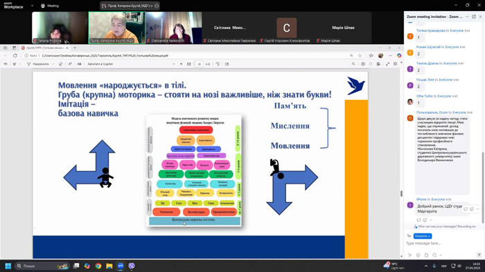 Професорка К. Крутій розпочала лекцію з постановки фундаментального питання: що таке мовлення і яке його значення в житті дитини. У доступній формі, з прикладами з реального життя та власної практики, вона пояснила студентам відмінності між базовими поняттями: комунікація, мова, мовлення, акцентуючи увагу на тому, що ці поняття, хоч і взаємопов’язані, мають різні функціональні й нейропсихологічні основи.