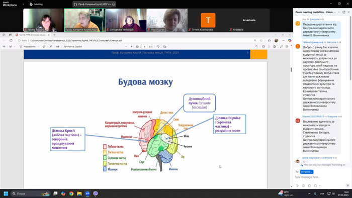 У лекції було докладно розглянуто зони мозку, які відповідають за розуміння та продукування мовлення: зона Брока, зона Верніке, моторна й сенсорна кора, лобові частки, а також взаємозв’язок між пізнавальними процесами (увагою, пам’яттю, мисленням) та мовленнєвими функціями. Студенти мали можливість переглянути схематичні зображення мозку, що дозволило краще зрозуміти локалізацію й функції відповідних ділянок.
