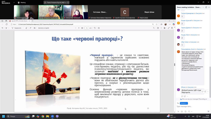 Важливою частиною лекції було представлення так званих «червоних прапорців» – ознак, що можуть свідчити про атиповий мовленнєвий розвиток і потребують негайного реагування з боку батьків і фахівців. До таких ознак належать: відсутність гуління після 6 міс.; відсутність лепету до 12 міс.; не реагує на звернення на ім’я; не використовує жодного слова у 18 міс.; має складнощі з імітацією звуків, жестів, міміки; мовлення незрозуміле навіть для близьких дорослих після 3 років; мовлення зникає або регресує.