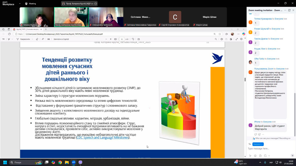 27 травня 2025 року відбулася надзвичайно пізнавальна й актуальна подія для студентів спеціальності 012 /А2 «Дошкільна освіта» – відкрита лекція, яку в онлайн-форматі Zoom прочитала відомий науковець, професор Маріупольського державного університету, доктор педагогічних наук, автор численних праць із проблем дошкільної освіти Катерина Леонідівна Крутій. Захід було організовано для студентів денної та заочної форми навчання, і він проходив в інтерактивному форматі, що дало можливість учасникам не тільки отримати теоретичні знання, а й активно взаємодіяти з лекторкою, ставити запитання, ділитися власними спостереженнями та педагогічним досвідом.