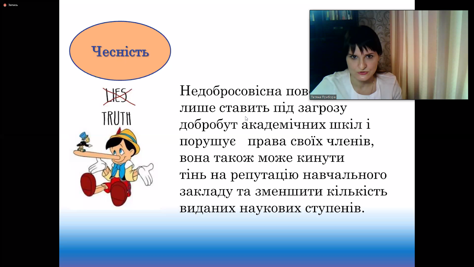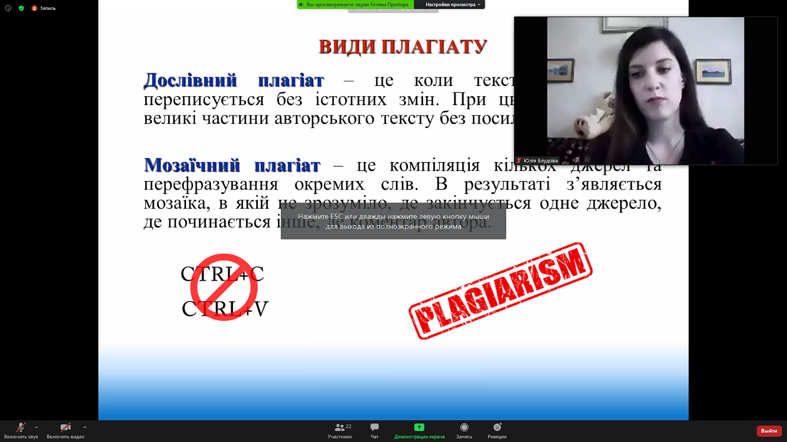 Під час лекції були розглянуті наступні питання: зміст та вимоги до академічної доброчесності, види порушень академічної доброчесності, запобігання академічного плагіату та його виявлення у наукових роботах.