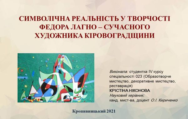 Робота Крістіни Ніконової присвячена виявленню особливостей абстрактного живопису та книжкової ілюстрації у творчості художника Федора Лагно, двічі лауреата обласної художньої премії ім. О. О. Осмьоркіна. Перше знайомство студентки з творчістю митця відбулося під час участі в регіональній науково-практичній конференції «Мистецтвознавчі читання-2020» (26.11.2020): «Абстракції в творчості художників-земляків» (до 128-ї річниці з дня народження О. О. Осмьоркіна), яка традиційно відбулася у Художньо-меморіальному музеї О. О. Осмьоркіна. Крістіна виступила тут з доповіддю «Істина в абстракції: символічна творчість Федора Лагно», яка презентована на сайті музею (https://www.osmerkinmuseum.kr.ua/apub/ach2020-06.pdf).