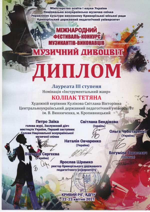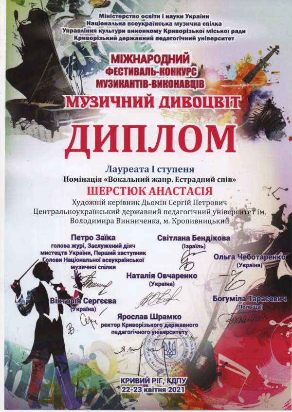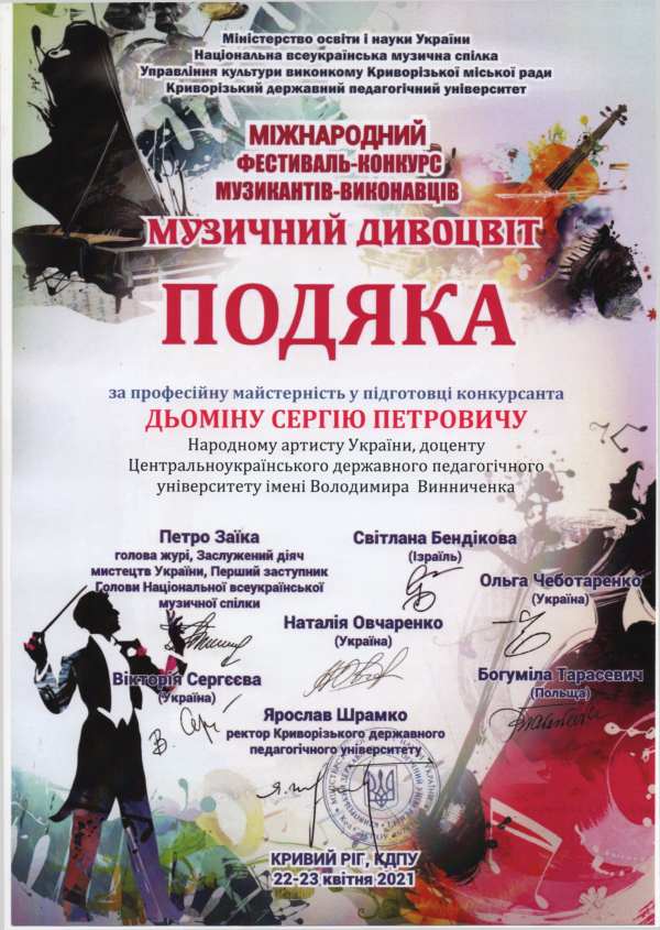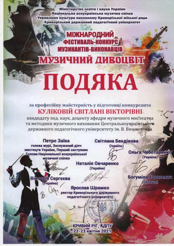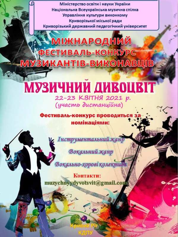 22-23 квітня 2021 року відбувся Міжнародний фестиваль-конкурс музикантів-виконавців «Музичний дивоцвіт», який проходив у дистанційному форматі на базі музично-хореографічного відділення факультету мистецтв Криворізького державного педагогічного університету.