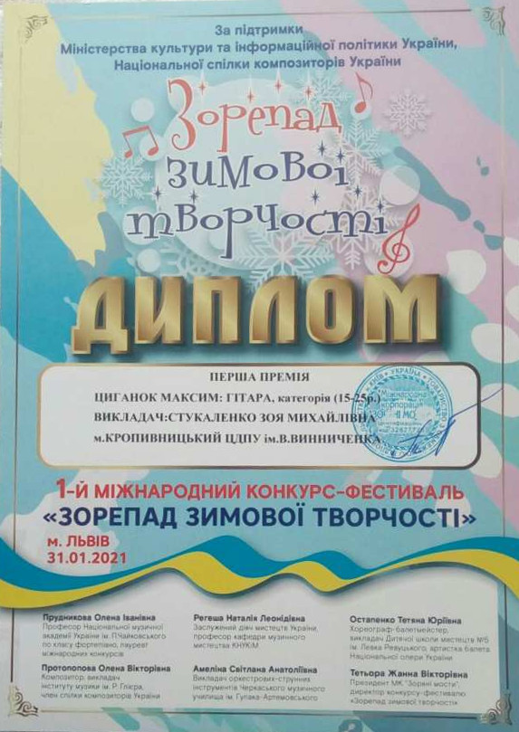 За запрошенням Центру освітніх інновацій та творчості «Гармонія» (м. Київ), студент І-го курсу мистецького факультету Центральноукраїнського державного педагогічного університету імені Володимира Винниченка Максим Циганок (клас кандидата педагогічних наук, ст. викладача Зої Михайлівни Стукаленко) взяв участь у  Х Міжнародному багатожанровому дистанційному фестивалі-конкурсі мистецтв «Talent Fest» – і посів перше місце!