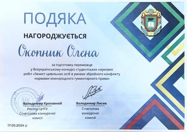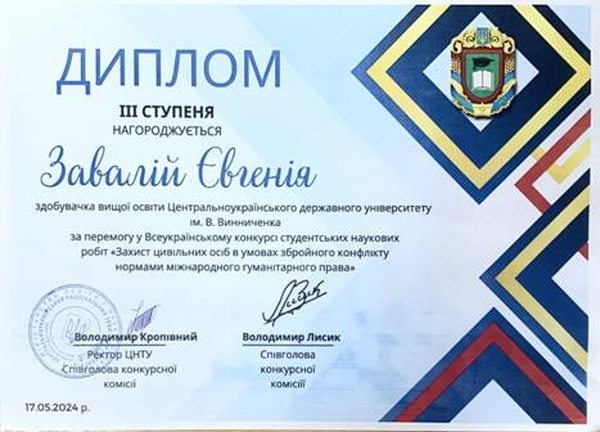 Диплом ІІІ ступеня на Всеукраїнському творчому конкурсі наукових робіт «Захист цивільних осіб в умовах збройного конфлікту нормами міжнародного гуманітарного права»