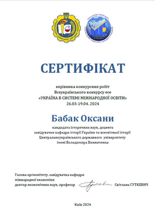 Науковий керівник – кандидат історичних наук, доцент Бабак Оксана Іванівна