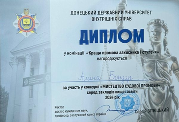 Диплом І ступеня на конкурсі «МИСТЕЦТВО СУДОВОЇ ПРОМОВИ» у номінації «Краща промова захисника»