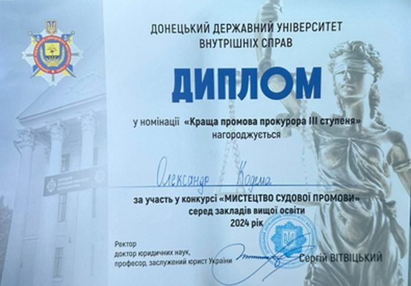 Диплом ІІІ ступеня на конкурсі «МИСТЕЦТВО СУДОВОЇ ПРОМОВИ» у номінації «Краща промова прокурора»