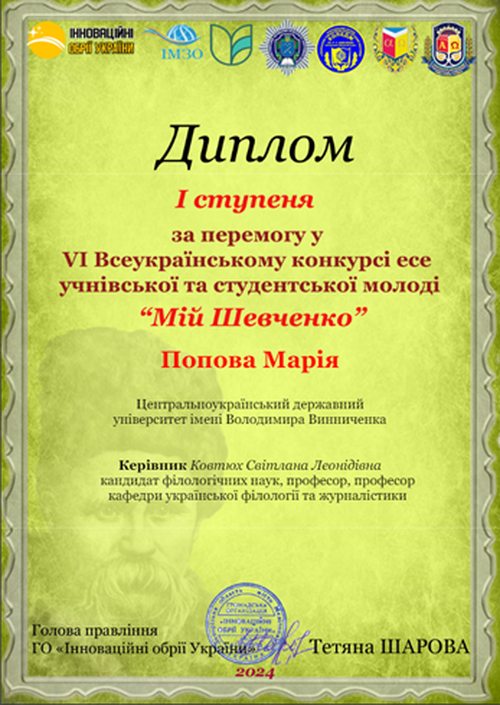 Диплом І ступеня на Всеукраїнському конкурсі есе “Мій Шевченко”