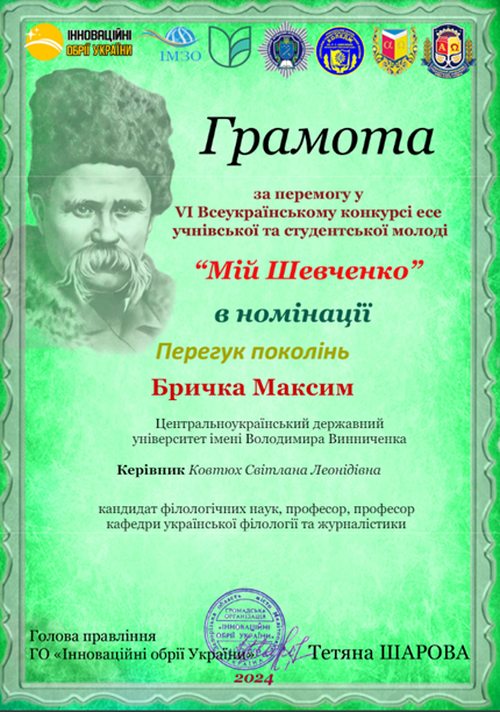 Переможець VI Всеукраїнського конкурсу есе учнівської та студентської молоді “Мій Шевченко” в номінації “Перегук поколінь”