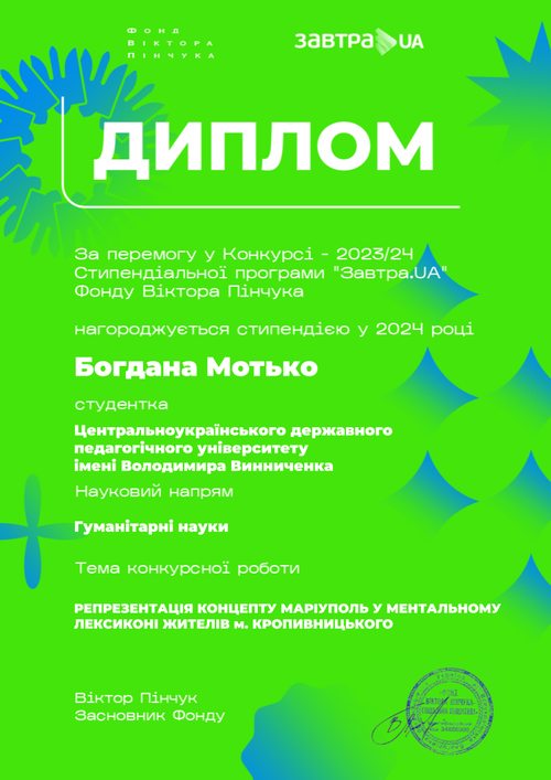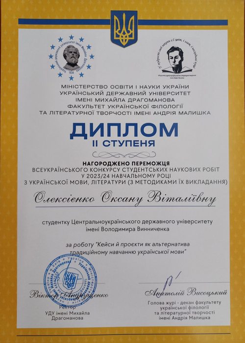 Диплом ІІ ступеня на Всеукраїнському конкурсі студентських наукових робіт з української мови та літератури