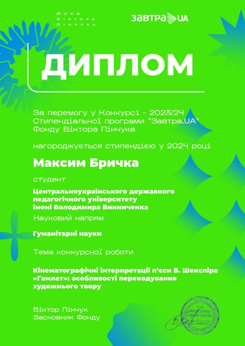 Диплом ІІІ ступеня на Всеукраїнському конкурсі студентських наукових робіт з української мови та літератури