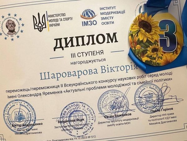 Диплом ІІІ ступеня на ІІ Всеукраїнському конкурсі наукових робіт серед молоді імені Олександра Яременка «Актуальні проблеми молодіжної та сімейної політики»