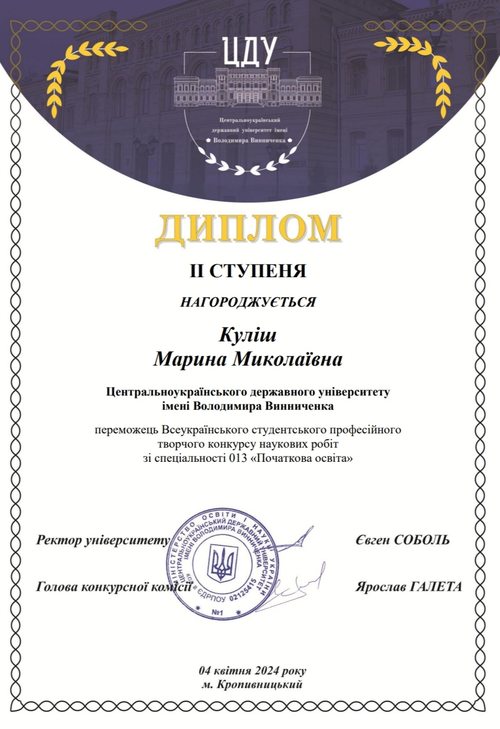 Диплом ІІ ступеня на Всеукраїнському студентському професійному творчому конкурсі наукових робіт зі спеціальності 013 “Початкова освіта»
