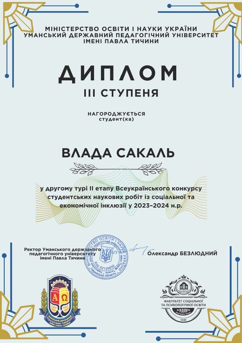 Диплом ІІІ ступеня на Всеукраїнському конкурсі студентських наукових робіт із соціальної та економічної інклюзії