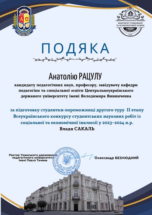 Науковий керівник – кандидат педагогічних наук, професор Рацул Анатолій Борисович