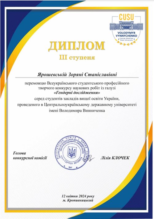 Диплом ІІІ ступеня на Всеукраїнському студентському професійному творчому конкурсі наукових робіт із галузі “Гендерні дослідження”