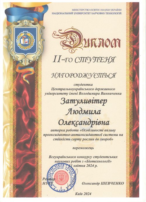 Диплом ІІ ступеня на Всеукраїнському конкурсі студентських наукових робіт з “Біотехнології”