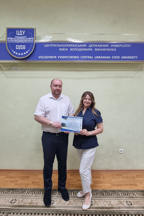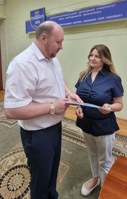 У п’ятницю, 6 травня 2025 року, Євген Соболь, ректор Центральноукраїнського державного університету імені Володимира Винниченка, координаторка Інформаційного Центру ЄС Юлія Верещак та Олена Арутюнян, директорка Молодіжного центру в Кіровоградській області та Центральноукраїнського державного будинку художньої та технічної творчості провели робочу зустріч, під час якої Євген Соболь вручив Олені Арутюнян Подяку за активну участь у популяризації демократичних європейських цінностей серед учнівської та студентської молоді Кіровоградщини.