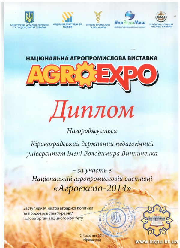 За ініціативою наукового відділу Кіровоградський державний педагогічний університет імені Володимира Винниченка був учасником Національної агропромислової виставки «АGROEXPO 2014», яка проводилась у м. Кіровограді 3-5 жовтня 2014 року. Активну участь у підготовці та проведенні виставки взяли доценти І. Лівицька, О. Єжова, В. Чубар, С. Кононенко, С. Рябець, старші викладачі Т. Куценко, О. Щирбул, завідувачі лабораторій І. Чорноіван, Л. Аксьонова, В. Марченко та інші.