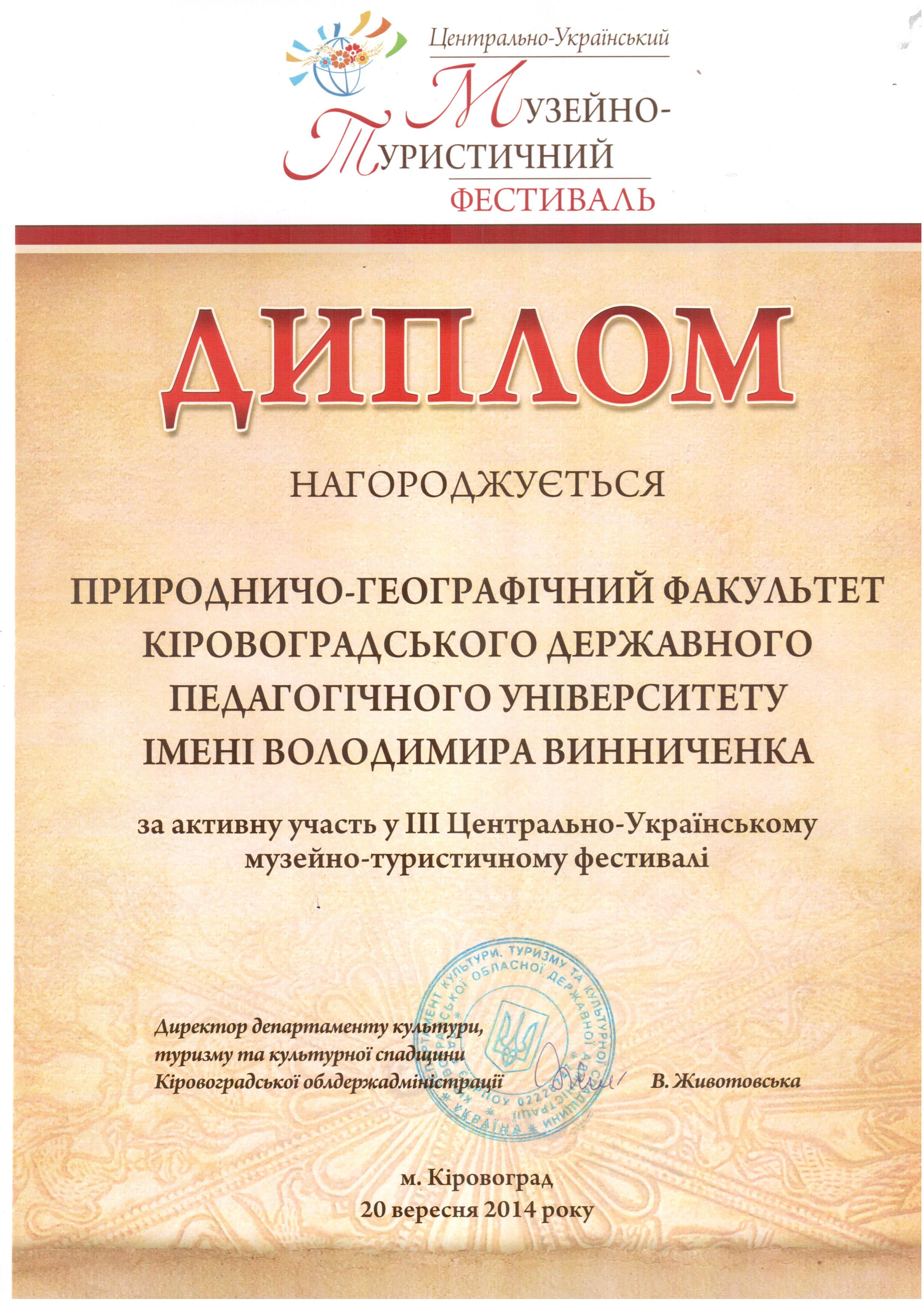 20 вересня 2014 року в рамках святкування Дня міста відбувся ІІІ Центрально-Український музейно-туристичний фестиваль, в якому вже традиційно беруть участь різні установи Кіровоградщини, які пов'язані з музейно-туристською діяльністю. Загалом музеїв на території нашої області досить значна кількість, відповідно на фестивалі вони мали можливість продемонструвати свої нові експозиції. Такі експозиції були представлені майже всіма адміністративними районами нашої області. Аналогічно фестиваль був представлений і експонатами різних туристських установ нашої області, а також установ, які пов'язані з туристською діяльністю.