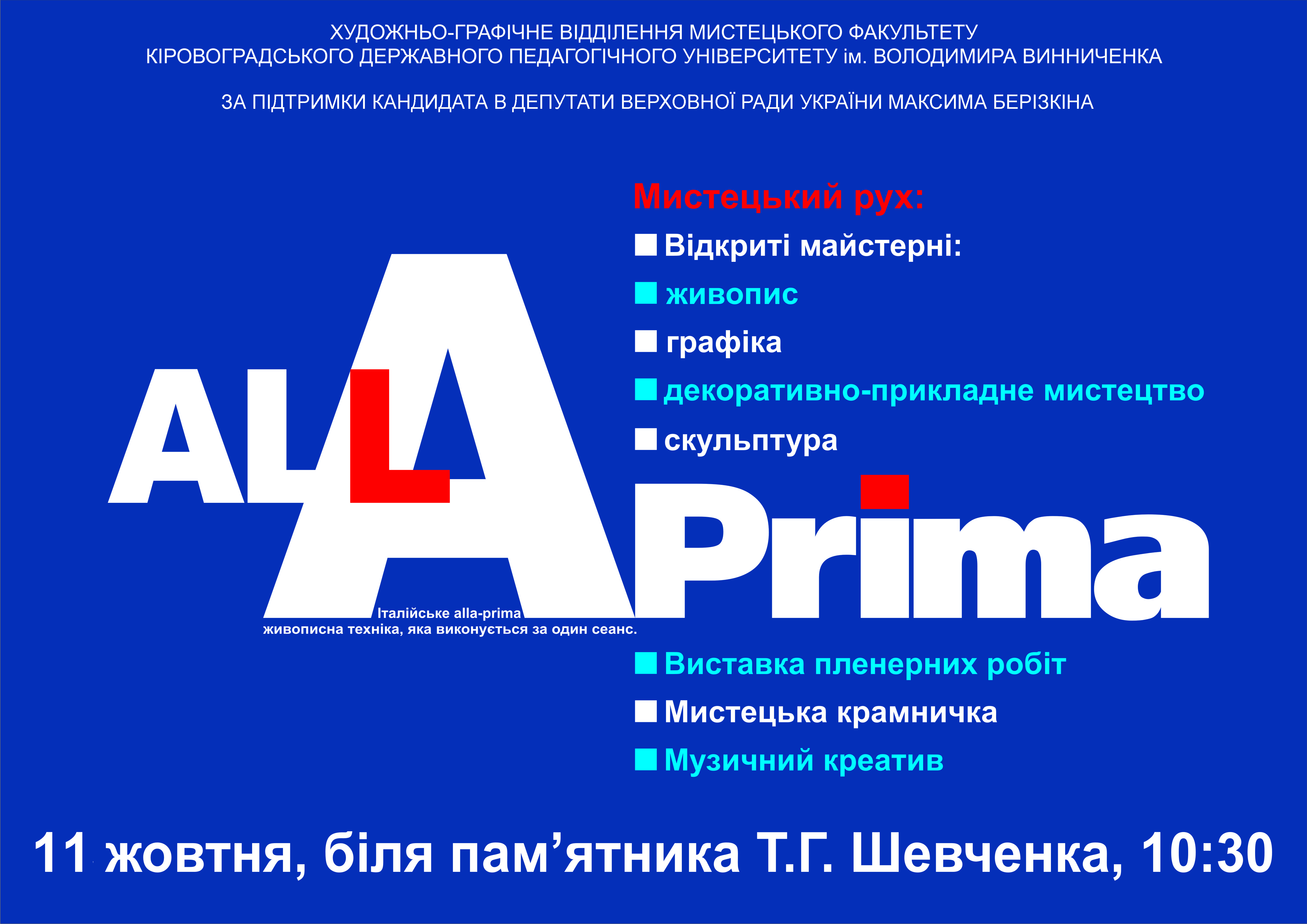 11 жовтня 2014 року до Дня художника відбудеться Мистецький Рух «ALLAPRIMA». Цей захід проводиться одинадцять років поспіль з ініціативи викладачів та студентів секції образотворчого мистецтва та дизайну мистецького факультету Кіровоградського державного педагогічного університету імені Володимира Винниченка.