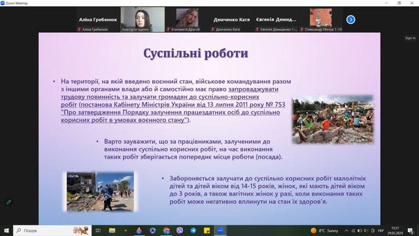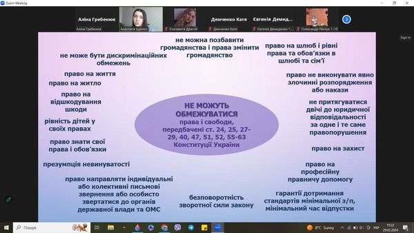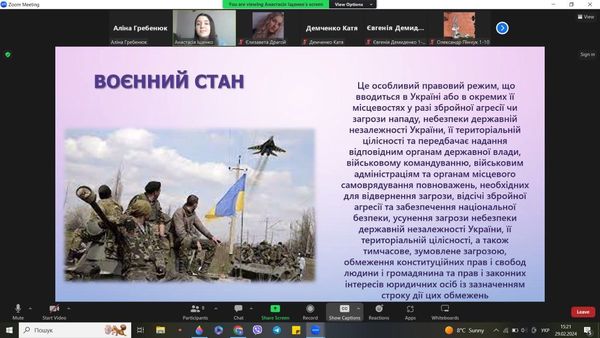 11 березня 2024 року відбулась онлайн-лекція на тему «Права та обов’язки громадян під час воєнного стану», яку організувала в межах проходження виробничої практики у юридичній клініці «Artium De Lex» ЦДУ ім. В. Винниченка Іщенко Анастасія для учнів 11 класу Ліцею № 4 м. Новоукраїнка.