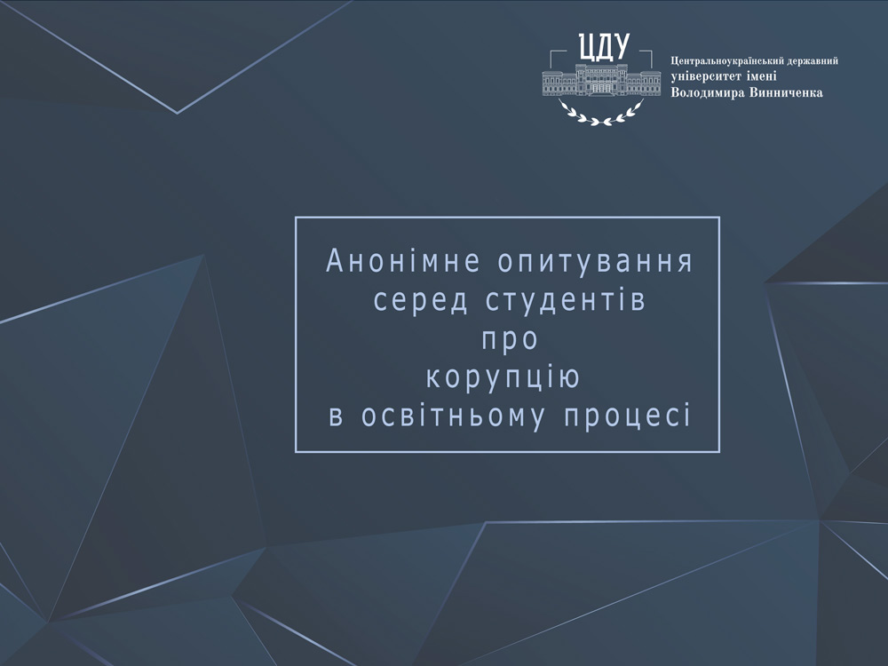 Відповідно до «Типового положення про уповноважений підрозділ (уповноважену особу) з питань запобігання та виявлення корупції» затвердженого Наказом НАЗК від 27.05.2021 року № 277/21; Плану заходів щодо дотримання законодавства з питань запобігання і протидії корупції в університеті та Розпорядження Ректора від 07 квітня 2025 року № 30 «Про моніторингове дослідження», з 8 по 10 квітня 2025 року проходило анонімне опитування серед студентів Центральноукраїнського державного університету імені Володимира Винниченка.
