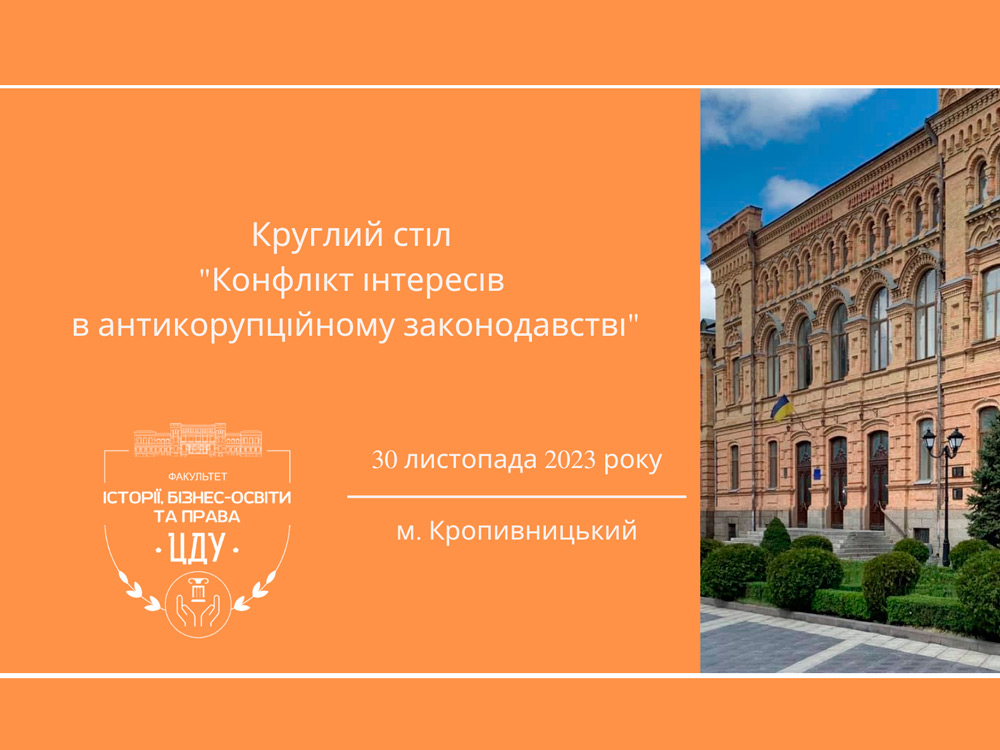 Щороку перед Міжнародним днем запобігання корупції в Центральноукраїнському державному університеті імені Володимира Винниченка проводяться заходи, присвячені запобіганню та боротьбі з корупцією. Цьогоріч на факультеті історії, бізнес-освіти та права 30 листопада відбувся круглий стіл на тему «Конфлікт інтересів в антикорупційному законодавстві», організатором якого є уповноважена особа з питань запобігання та виявлення корупції, доцент кафедри права та правоохоронної діяльності, кандидат юридичних наук, доцент Окопник О.М. Співорганізатор – Юридична клініка «Аrtium De Lex» ЦДУ імені В. Винниченка під керівництвом доцента кафедри права та правоохоронної діяльності, кандидата юридичних наук, доцента Зеленко І.П.