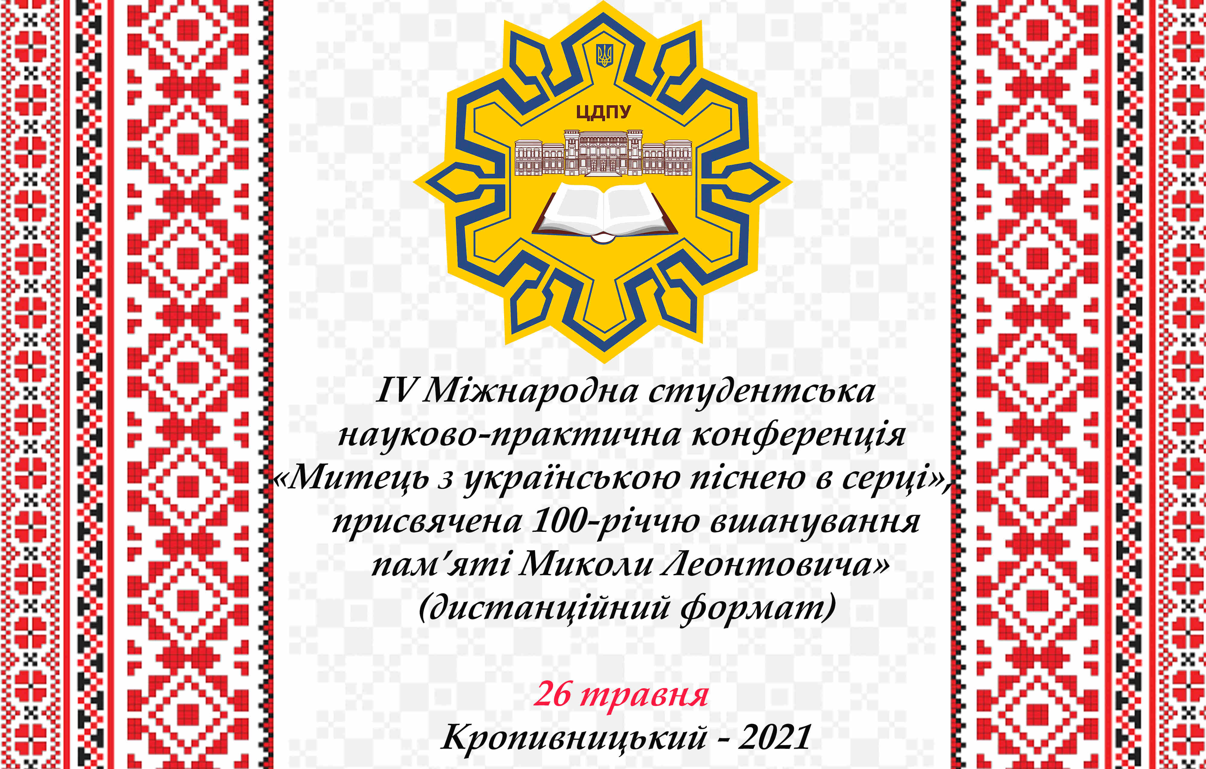 Запрошуємо 26 травня 2021 року взяти участь у ІV Міжнародній студентській науково-практичній конференції: «Митець з українською піснею в серці», присвяченій 100-річчю вшанування пам’яті Миколи Леонтовича», яка відбудеться у дистанційному форматі.