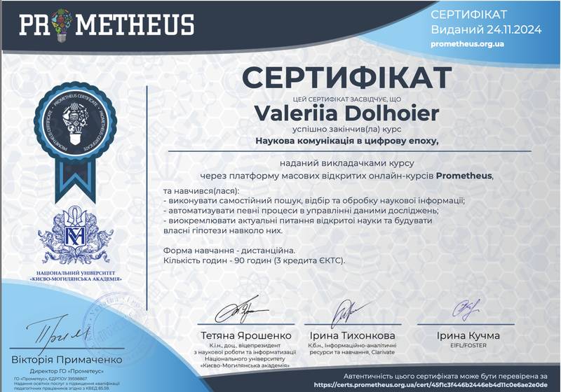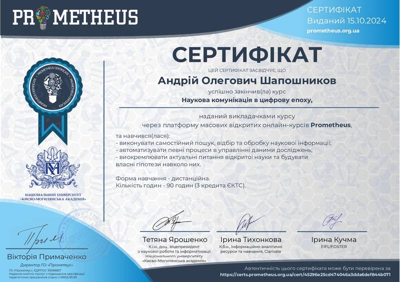 Аспіранти Д. Бугор, О. Ганзенко, В. Долгоєр, І. Кабузенко, О. Кравчук, О. Рубля, М. Хребтов, А. Цуран, А. Шапошніков долучилися до онлайн-курсів за напрямком інформаційних технологій, зокрема, «Наукова комунікація в цифрову епоху», «Академічна доброчесність: онлайн-курс для викладачів», «Академічна доброчесність в університеті», «Цифрова безпека на персональному рівні» та інші, й по завершенні отримали сертифікати, успішно виконавши завдання курсів.