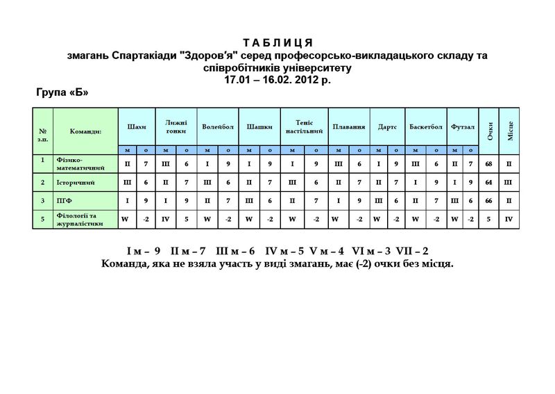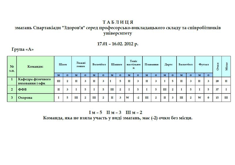 З 17 січня по 16 лютого 2012 року у Кіровоградському державному педагогічному університеті імені В.Винниченка проходила традиційна Спартакіада «Здоров’я» серед професорсько-викладацького складу та співробітників вузу. Команди факультетів, як і у минулому році, були розділені на дві підгрупи «А» і «Б». В основі розподілу була покладена підготовленість команд, а також бажання членів команд мати суперниками саме визначених за групами учасників.