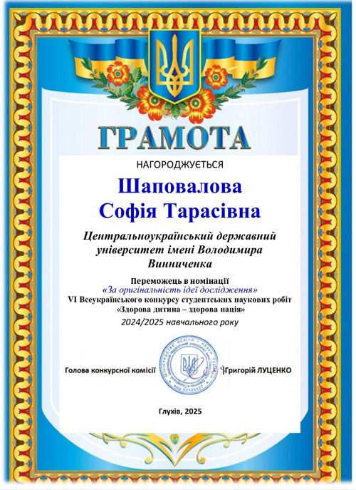 Шаповалова Софія, магістрантка факультету фізичного виховання стала переможцем у номінації "За оригінальність ідеї дослідження" VI Всеукраїнського конкурсу студентських наукових робіт "Здорова дитина - здорова нація".