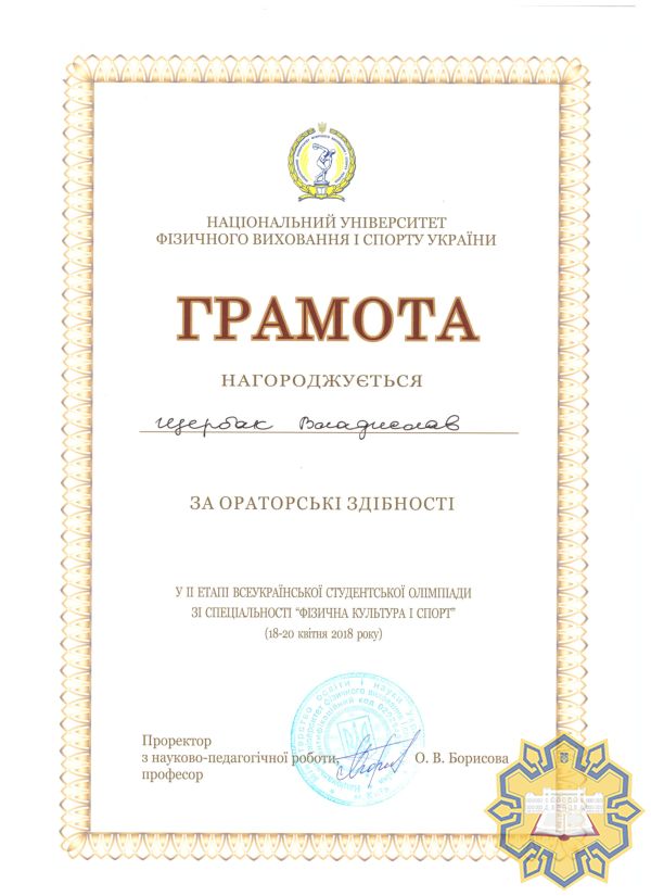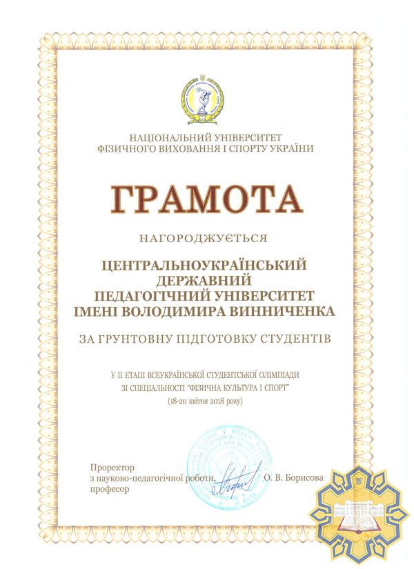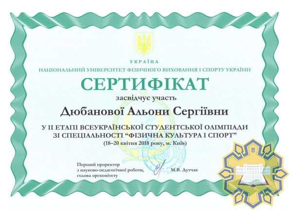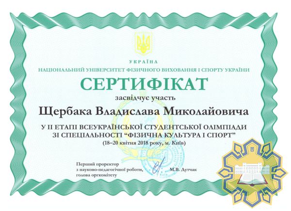 18-20 квітня 2018 року у м. Києві на базі Національного університету фізичного виховання і спорту України відбувся II етап всеукраїнської студентської олімпіади зі спеціальності «Фізична культура і спорт». В Олімпіаді брали участь 58 студентів із 18 закладів вищої освіти України. Наш університет представляли двоє студентів спеціальності «Спорт»: Щербак Владислав – IV курс та Дюбанова Альона – ІІІ курс. Підготовкою студентів до олімпіади займався професор кафедри теорії та методики олімпійського і професійного спорту Воропай Сергій Миколайович.