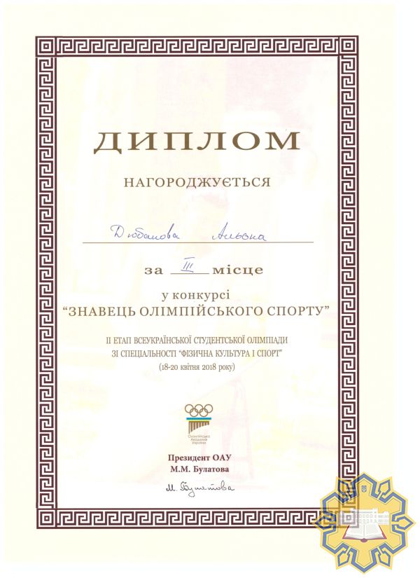 Але на цьому нагороди не закінчились. Вже в третій день олімпіади наша студентка ІІІ-го курсу Дюбанова Альона стала призеркою та посіла третє місце у конкурсі «Знавець олімпійського спорту».