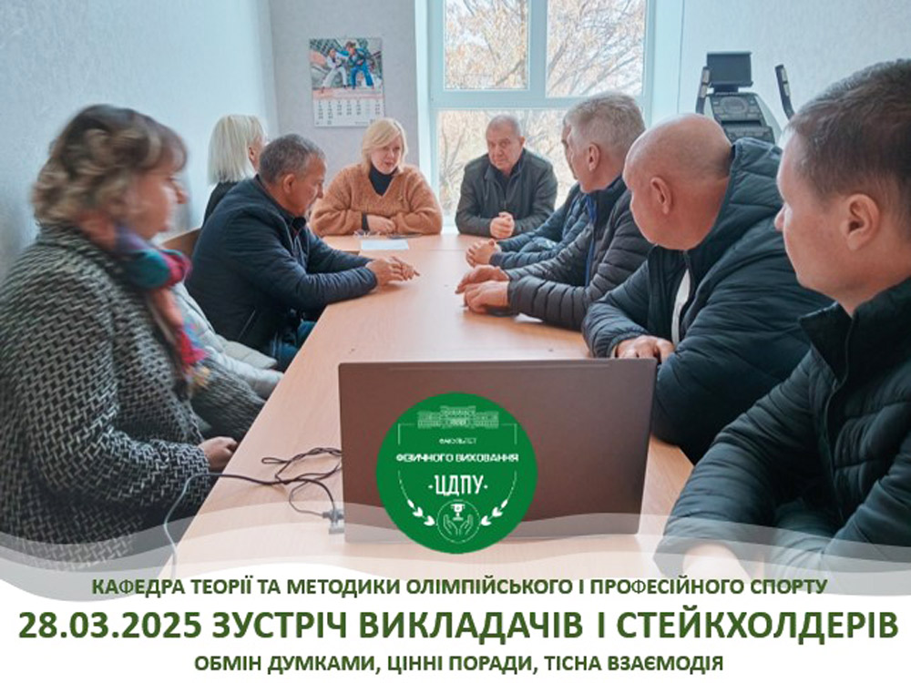 28.03.2025 року на факультеті фізичного виховання ЦДУ імені Володимира Винниченка відбулась зустріч із стейкхолдерами директорами спортивних шкіл нашого міста: КЗ "КДЮСШ-1" КМР - Жовтенком Ю. М, КЗ "КДЮСШ-2" КМР - Пархоменком В. О., КЗ "КДЮСШ-3" КМР - Івановим С. П., КЗ "КДЮСШ-4" КМР - Гавриленком М. І., а також начальником управління молоді та спорту Кропивницької міської ради Гурським В. В. На заході були присутні викладачі кафедри теорії та методики олімпійського і професійного спорту.