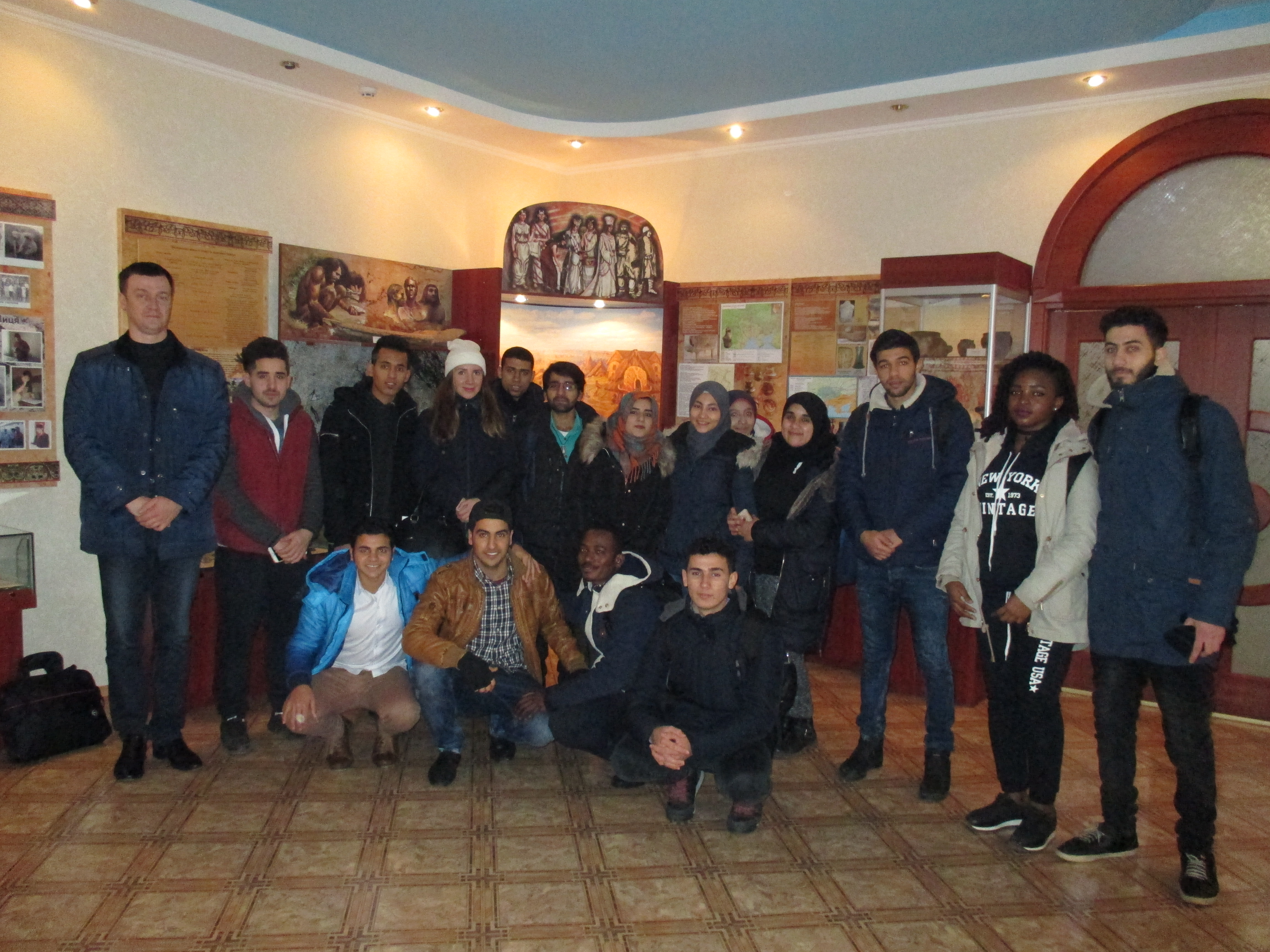 В археологічному музеї нас гостинно зустрів викладач кафедри історії України К. Панченко. Під час екскурсії студенти коротко ознайомилися з експозицією музею та історією нашого регіону. По завершенню розповіді студенти змогли отримати відповіді на свої питання. Спеціально для майбутніх медиків К. Панченко дозволив оглянути і сфотографувати знайдений на розкопках людський череп зі слідами трепанації. Наздвичайно приємно було бачити як студенти наввипередки поспішали записати свої враження до книги відгуків (арабською та англійською мовами). Було неочікувано та приємно почути від студента з Єгипту, що коли він вивчить українську мову – то буде розмовляти лише українською.