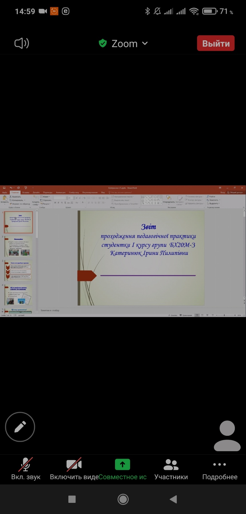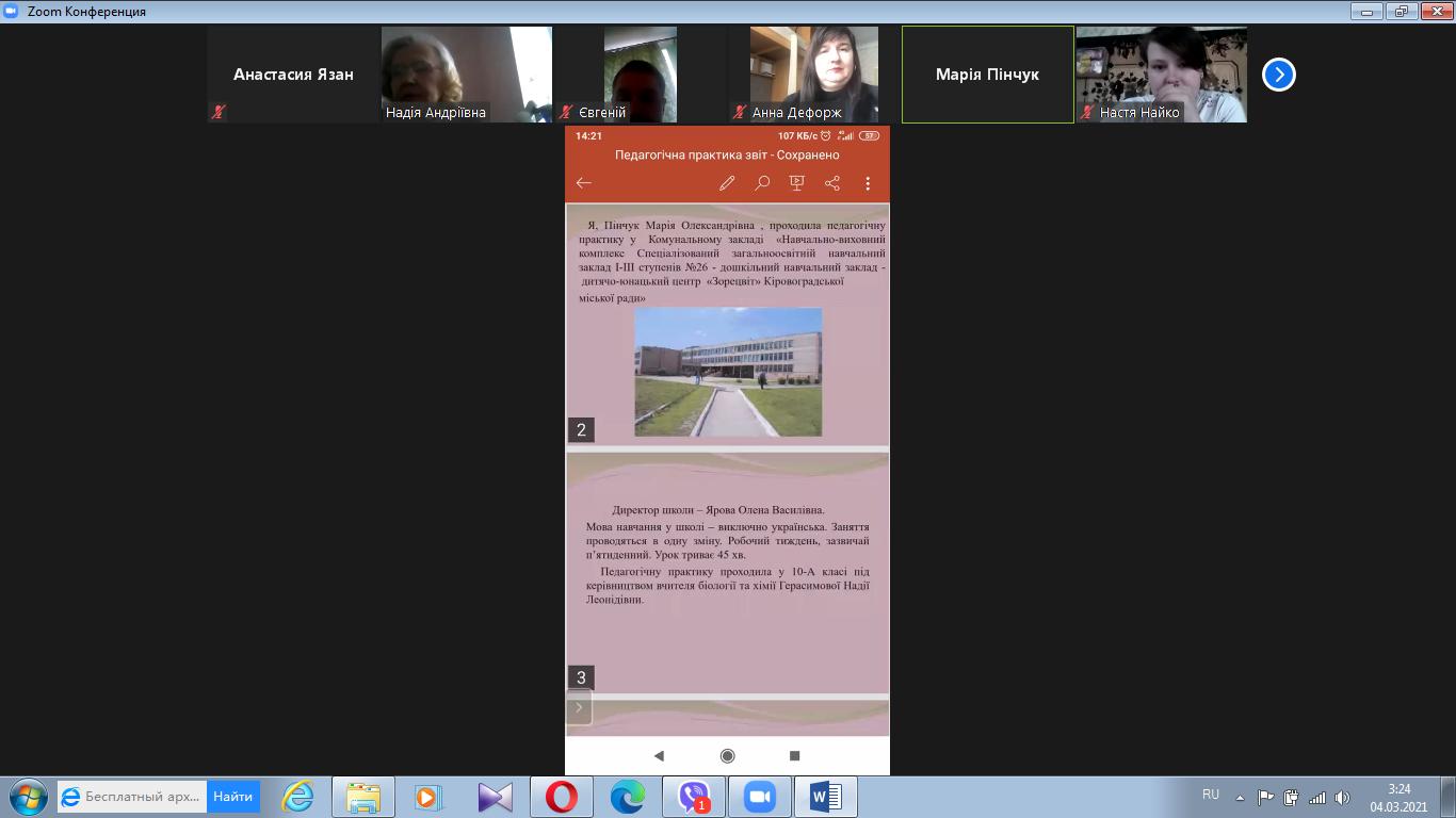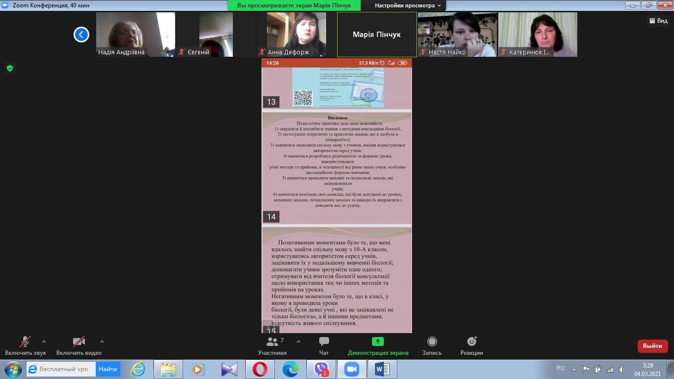 5 березня 2021 року в режимі Zoom-конференції за участі студентів магістрів першого року навчання заочної та денної форми, методистів з біології Н.А. Калініченко та Г.В. Дефорж а також заступника декана з навчально-методичної роботи ПГФ Н.М. Маслової, було проведено звітну конференцію із проходження педагогічної практики.