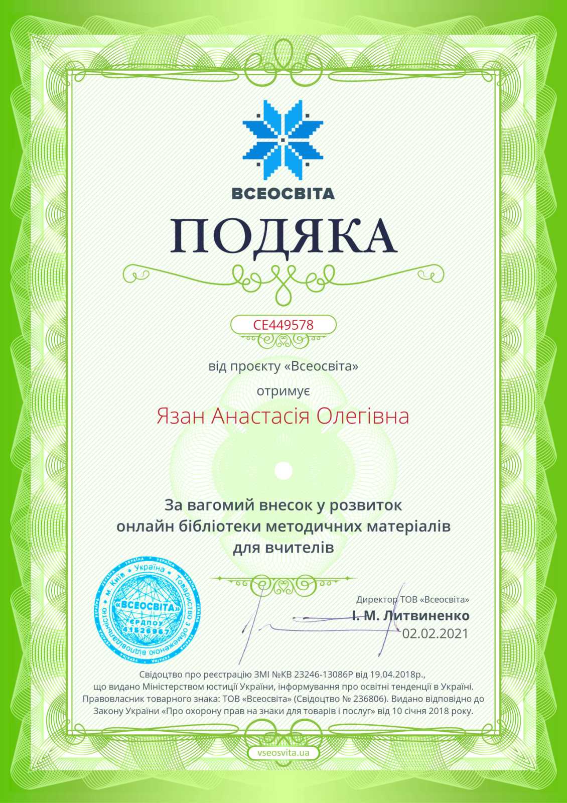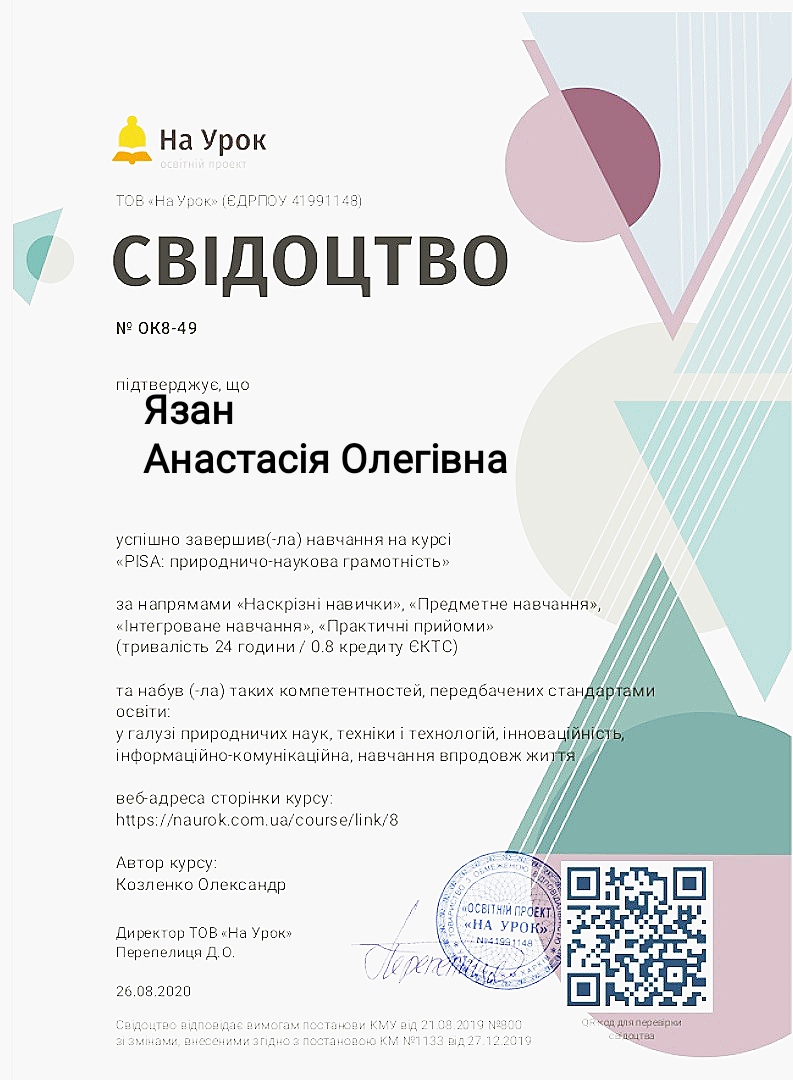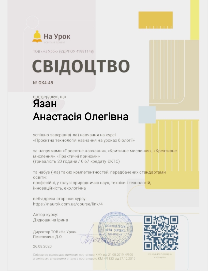 Також я пройшла курс підвищення кваліфікації «Дистанційне вивчення – прості вхід та вихід», на якому поглибила знання із використання і застосування інтерактивних технологій, різноманітних методів та засобів проведення цікавих уроків із біології.