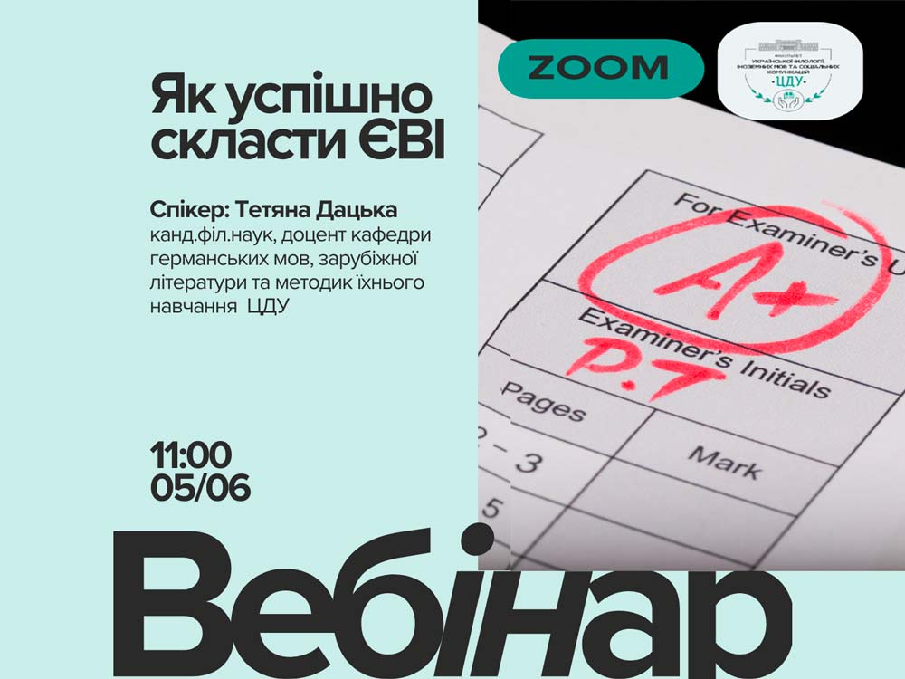 5 червня 2024 року доценти кафедри германських мов, зарубіжної літератури та методик їхнього навчання Тетяна Дацька та Вікторія Кочубей провели вебінар, присвячений особливостям складання єдиного вступного іспиту з англійської мови у 2024 році. У вебінарі взяла участь також Валерія Мандрейчук, студентка І курсу другого (магістерського) рівня вищої освіти за спеціальністю 014.021 Середня освіта. Англійська й німецька мови та зарубіжна література. До заходу доєдналися студенти-випускники бакалаврських програм, які реалізуються у Центральноукраїнському державному університеті імені Володимира Винниченка.