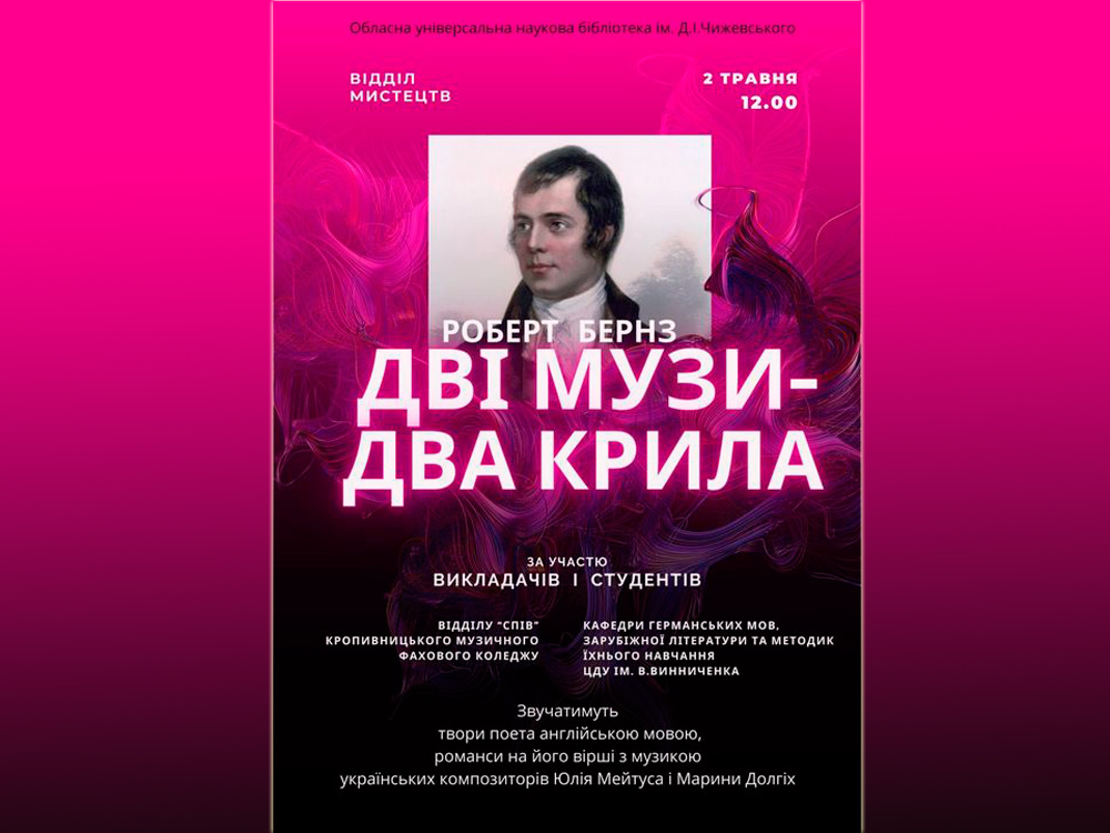 2 травня о 12:00 в Обласній науковій бібліотеці імені Дмитра Чижевського, в камерній атмосфері відділу мистецтв, відбудеться поетично-мистецьке дійство «Дві музи – два крила». На високій ноті класики звучатимуть романси на вірші Роберта Бернза з музикою українських композиторів Юлія Мейтуса і Марини Долгіх. А чудова поезія Роберта Бернза звучатиме в оригіналі – англійською мовою.