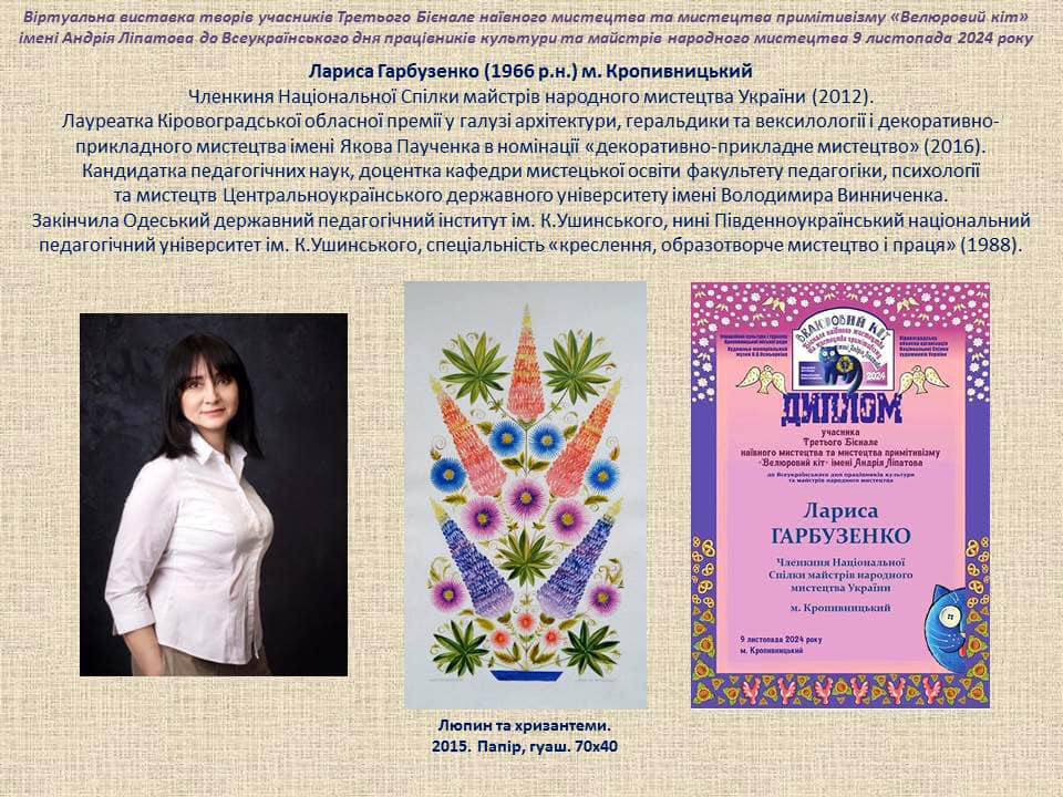 З нагоди Всеукраїнського дня працівників культури та майстрів народного мистецтва, що відзначався 9 листопада, художньо-меморіальний музей Олександра Осмьоркіна вже втретє влаштував бієнале наївного мистецтва та мистецтва примітивізму «Велюровий кіт» імені Андрія Ліпатова.