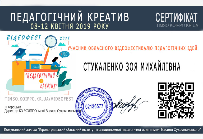 12 квітня 2019 року відбувся відеофестиваль педагогічних ідей “Педагогічний креатив”, у якому взяла участь кандидат педагогічних наук, старший викладач кафедри музичного мистецтва і хореографії мистецького факультету Центральноукраїнського державного педагогічного університету імені Володимира Винниченка Зоя Михайлівна Стукаленко (номінація STEAM-технології (наука, технології, світ, арт-мистецтво, математика).